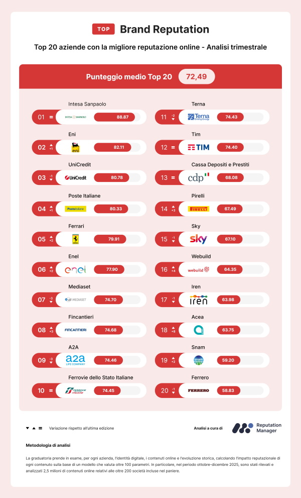 Intesa Sanpaolo, Eni e UniCredit occupano le prime tre posizioni della Top Brand Reputation, la classifica elaborata da Reputation Manager® che quantifica la reputazione online in Italia di oltre 200 aziende, estendendo il monitoraggio anche a numerosi brand internazionali.